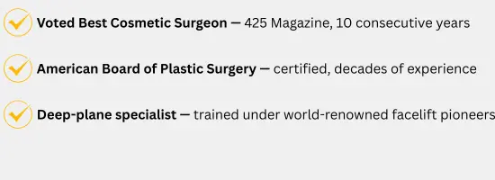 Dr. David Stephens is a board-certified plastic surgeon with decades of experience in advanced facelift techniques starting with being trained under world-renowned facelift pioneers. Patients trust him for his artistry, precision, and ability to deliver natural, elegant outcomes that never look overdone.